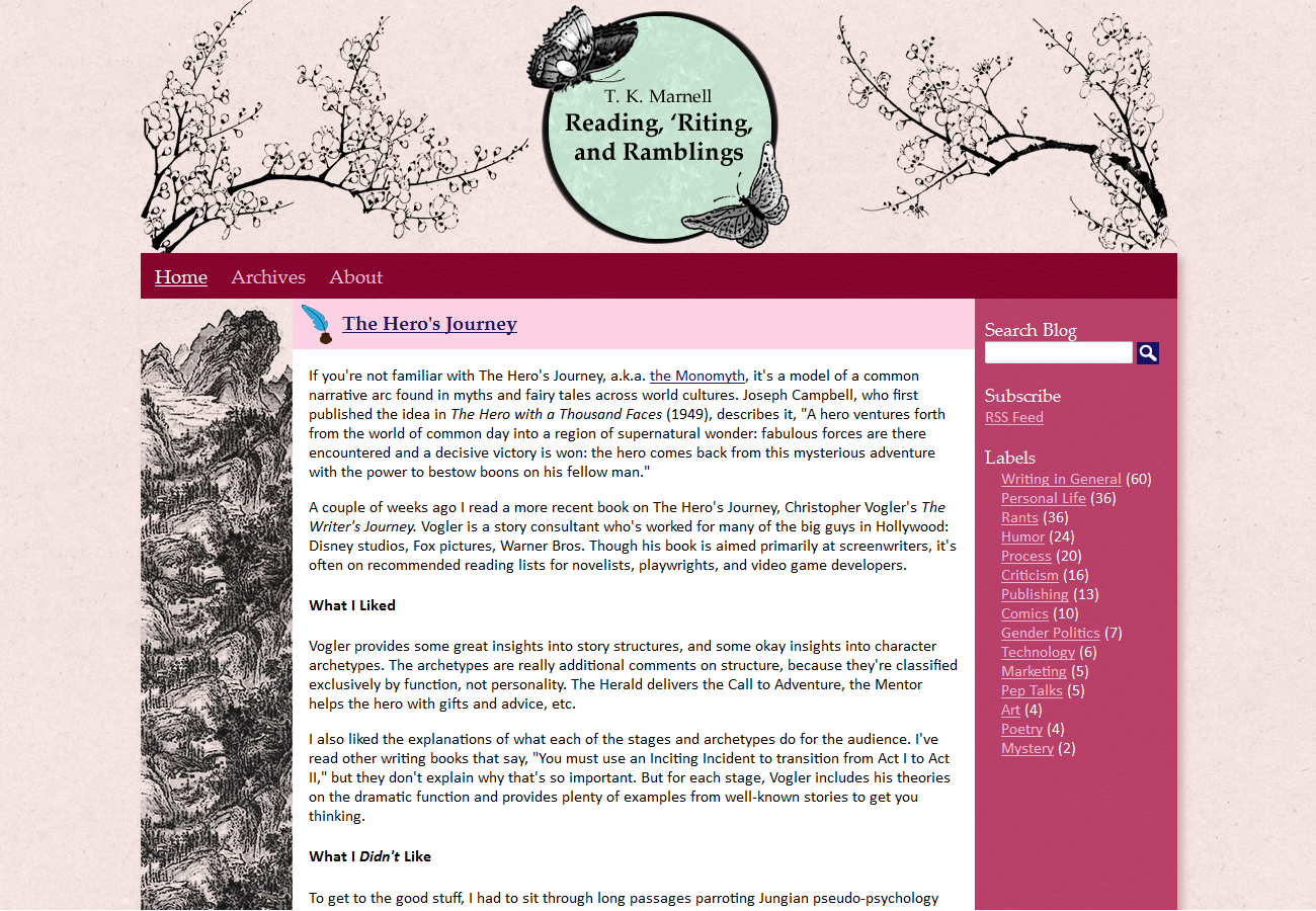 The rice paper texture in the background came from subtlepatterns.com, which is my go-to resource for patterns that look natural and, well, subtle. The plum blossoms, butterflies, and mountains came from public domain images I found on Wikimedia Commons.